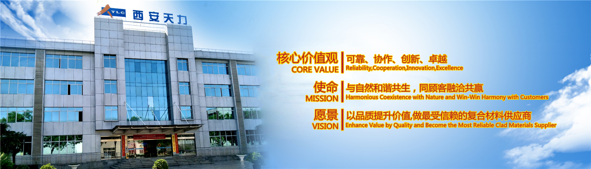 西安天力金屬?gòu)?fù)合材料股份有限公司是西北有色金屬研究院(集團(tuán))產(chǎn)業(yè)化上市公司“西部材料”控股的獨(dú)立法人公司,是專(zhuān)業(yè)從事層狀金屬?gòu)?fù)合材料研究及生產(chǎn)的高新技術(shù)企業(yè),成立于2003年12月25日,位于西安經(jīng)濟(jì)技術(shù)開(kāi)發(fā)區(qū)涇渭工業(yè)園,注冊(cè)資本10895萬(wàn)股,擁有生產(chǎn)廠房23000余平米,各類(lèi)生產(chǎn)設(shè)備200余臺(tái)套及兩塊條件優(yōu)越的爆炸復(fù)合場(chǎng)地,形成年產(chǎn)25000噸層狀復(fù)合材料的生產(chǎn)加工能力……